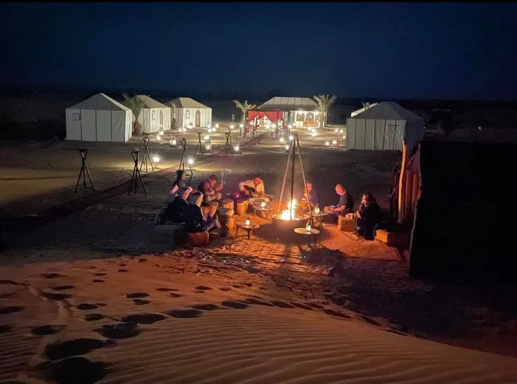 We travel south through evolving landscapes: cedar forests, mountain passes, and the dramatic gorge of the Ziz Valley. The destination is the golden dunes of Erg Chebbi. Here, you leave the vehicle behind for a serene camel trek into the heart of the desert as the sun begins its descent. You arrive at our exclusive luxury desert camp, a permanent oasis of beautifully appointed tents with proper beds and en-suites. The night is spent under a infinite sky, with a feast of traditional food and the rhythms of Berber music around the fire.